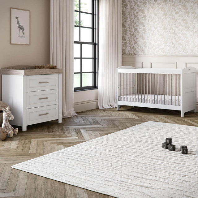 The Valencia 2-piece nursery set is a fresh, neutral canvas for creating your dream nursery. Designed to grow with your child from newborn to toddler, the furniture set includes a cot to toddler bed and a spacious dresser with removable changer top for added longevity. Crafted for durability over the years, the elegant collection features a timeless white finish and natural ash accents