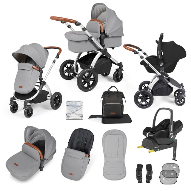 Ickle Bubba Stomp Luxe 12 Piece Travel System with Maxi-Cosi Cabriofix i-Size & Base - Silver/Pearl Grey/Tan